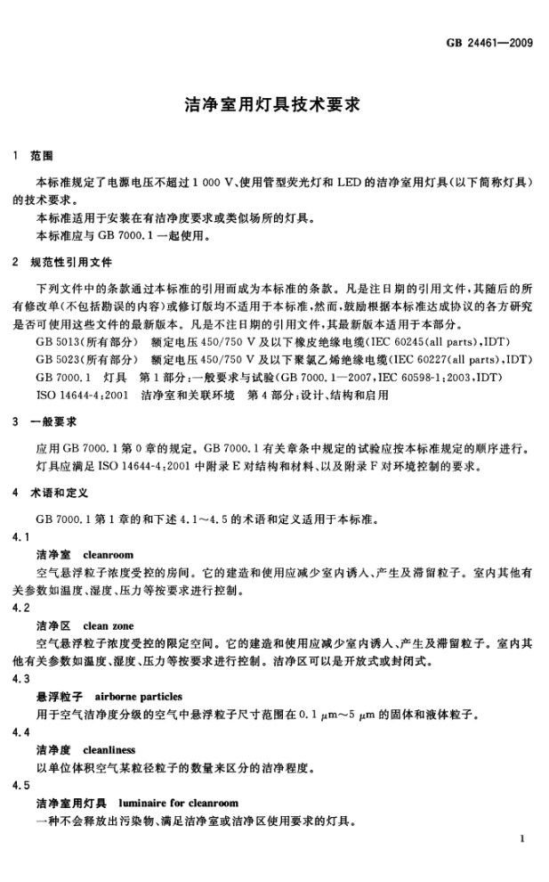 GB24461-2009 潔凈室用燈具技術要求