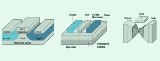 由于量子力學隧道效應,電子可以穿越絕緣體,這將使元件功能失效。人們開始尋找一種新型晶體管,可以進一步提高未來集成電路的性能,作為傳統晶體管的替代品。目前有很多研究,但還沒有領先者可以取代硅MOSFET。研究人員列出了一系列MOSFET替代品,包括隧道場效應晶體管TFET,碳納米管場效應晶體管,單原子晶體管。