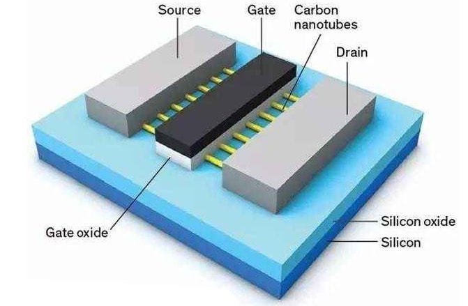 在CNFET中,源極和漏極之間的溝道由碳納米管組成,其直徑僅有1–3 nm, 意味著其作為晶體管的溝道更容易被柵控制。因此, 碳納米管晶體管比傳統硅基晶體管在比例縮減上的潛力會更大。