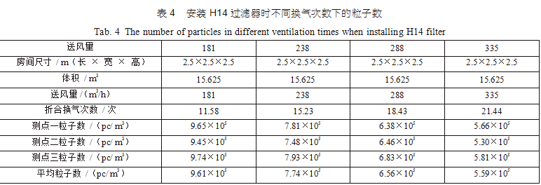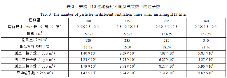 在空調(diào)機(jī)房中新建了三間2.5m×2.5m×2.5m的潔凈間,從空調(diào)主風(fēng)管引風(fēng),每支支管設(shè)置調(diào)節(jié) 閥,并設(shè)排風(fēng)機(jī)進(jìn)行全排,送回風(fēng)口及測點(diǎn)布置分別如圖 3(每點(diǎn)取樣三次,取平均值)??紤]到初中效過濾器對(duì)最后潔凈度的影響和最后理論塵埃數(shù)量 計(jì)算的方便,試驗(yàn)用初中效繼續(xù)分別為G4、F8,三個(gè)房間分別安裝高效過濾器,風(fēng)量500m3/h,第一組數(shù)據(jù)為送風(fēng)量按GMP 驗(yàn)證指南推薦換氣次數(shù)保持不變,分別用H12、H13、H14、U15過濾器,第二組數(shù)據(jù)為采用H13高效過濾器,調(diào)節(jié)風(fēng)量 ;第三組數(shù)據(jù)為采用H14高效過濾器,調(diào)節(jié)風(fēng)量,分別測得塵埃粒子數(shù),并列表得出不同的換氣次數(shù)下對(duì)應(yīng)的塵埃數(shù)如表2、表3、表4。