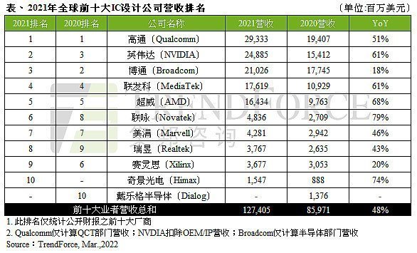 據(jù)TrendForce集邦咨詢研究顯示,2021年由于各類終端應(yīng)用需求強(qiáng)勁,導(dǎo)致晶圓缺貨,全球IC產(chǎn)業(yè)嚴(yán)重供不應(yīng)求,連帶使芯片價(jià)格上漲,拉抬2021年全球前十大IC設(shè)計(jì)業(yè)者營(yíng)收至1,274億美元,年增48%。
