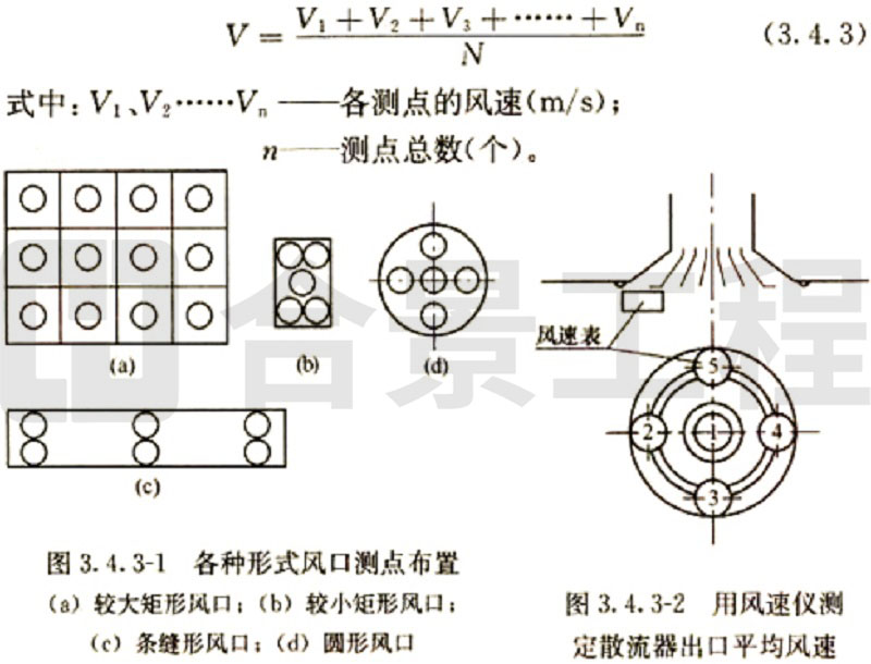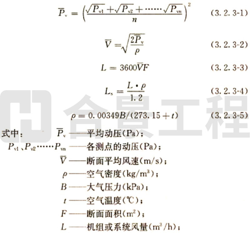 (2)當采用熱電風速計或數字式風遺計測量風量時,斷面平均風速為各測點風速測量值的平均值,實測風量和標準風量的計算方法與畢托管和微壓計測量計算方法相同。