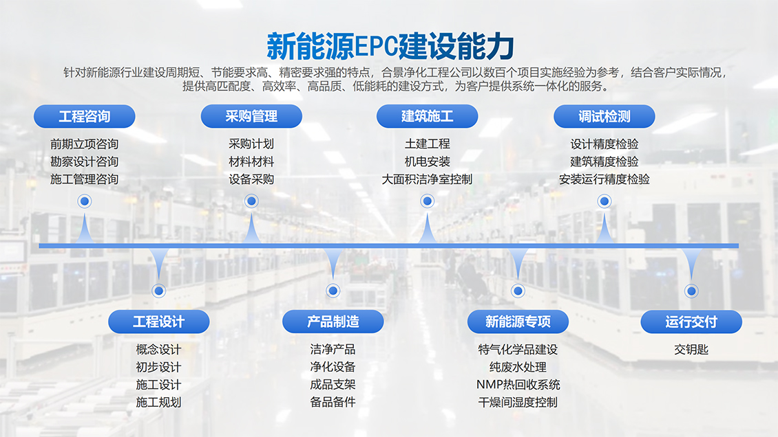 合景智慧建設(shè)是工業(yè)高端制造領(lǐng)域生產(chǎn)車間建設(shè)高潔凈度和低露點(diǎn)凈化車間內(nèi)裝工程的規(guī)劃、設(shè)計(jì)、采購(gòu)、施工與服務(wù)一體化總承包商,多年來,在大型廠房建設(shè)方面積累了大量豐富的低凈化車間內(nèi)裝工程設(shè)計(jì)和施工經(jīng)驗(yàn),特別是在產(chǎn)能規(guī)劃、公用工程、環(huán)境工程(溫度、低露點(diǎn)、高潔凈度)等領(lǐng)域的制造、工藝流程、節(jié)能環(huán)保等提供完善的系統(tǒng)集成工程建設(shè)解決方案。